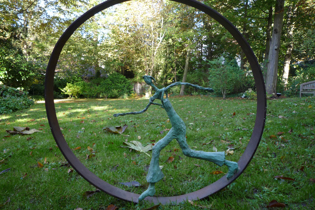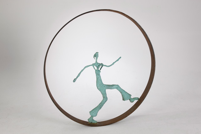 Beweging om bij stil te staan, een perpetuum mobile Deze figuur is goed op weg. En de weg is doorgaans het doel. Maar wacht eens... voert deze weg omhoog of omlaag, en komt er wel een eind aan? Of loopt iemand zich hier voor niks een slag in de rondte, in de tredmolen van het leven? En dan nóg wat: wie beweegt er eigenlijk – de man of de weg, als een tapis roulant?