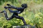 L'homme est entraîné par un élan et court, les cheveux dans le vent, vers une destination inconnue.De man wordt gedreven door zijn bevlogenheid en rent, met haren in de wind, naar aan onbekende bestemming.